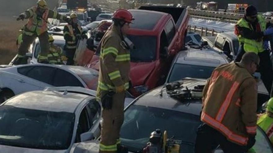 "Niebla y hielo en el puente Queens Creek a las 7.51 am cuando comenzaron los choques", detalló la Policía, tras confirmar que están investigando las causas del enorme atasco.
