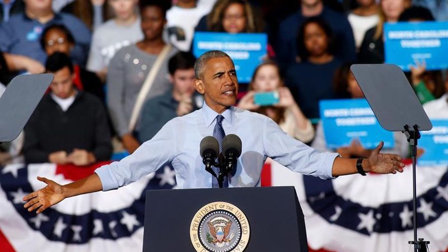 "Ustedes pueden elegir a la primera mujer presidenta (...), tienen la oportunidad de hacer historia", señaló Obama durante un mitin en Chapel Hill, Carolina del Norte. "Si Hillary gana en Carolina del Norte, ganará. Y cuando dije que el destino de la República está en vuestras manos, no estaba bromeando", agregó. "¡Rechacen el miedo! ¡Elijan la esperanza! ¡Voten!", arengó.