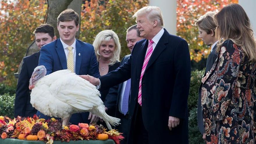 El presidente de EEUU, Donald Trump, cumplió hoy con la tradición de indultar a dos pavos que se salvarán de ser degustados en Acción de Gracias, antes de partir hacia su club de Palm Beach (Florida) para celebrar allí en familia esta festividad, la más popular del país.
