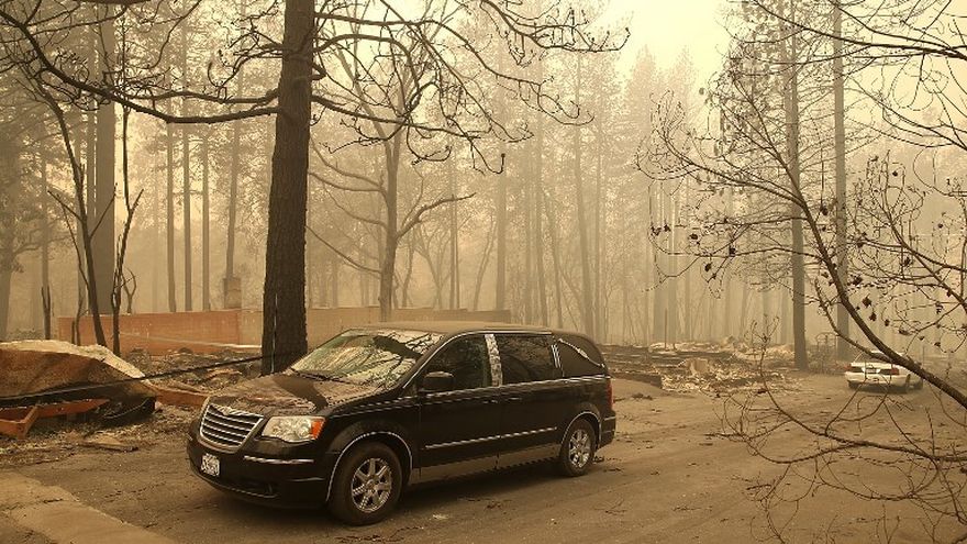 El humo sobre la localidad de Paradise podía verse desde kilómetros, apenas dejando pasar al sol. Tras el paso de las llamas, varios autos fueron reducidos a carcasas metálicas, mientras las líneas eléctricas también alimentaron el fuego.