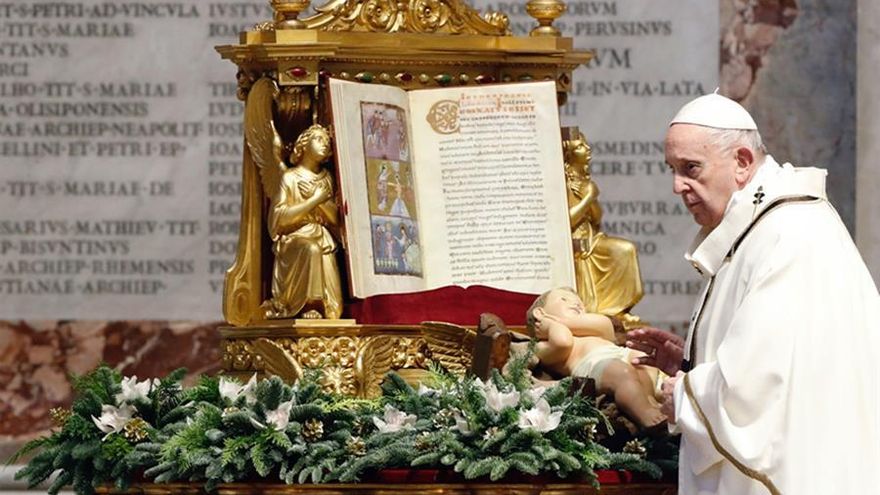 La misa comenzó a las 10.00 horas locales, cuando el papa recorrió el pasillo central de la basílica vaticana, mientras el coro entonaba el "Adeste fideles", y se dirigió hasta la imagen del Niño Jesús, situada a los pies del altar papal, para adorarla.