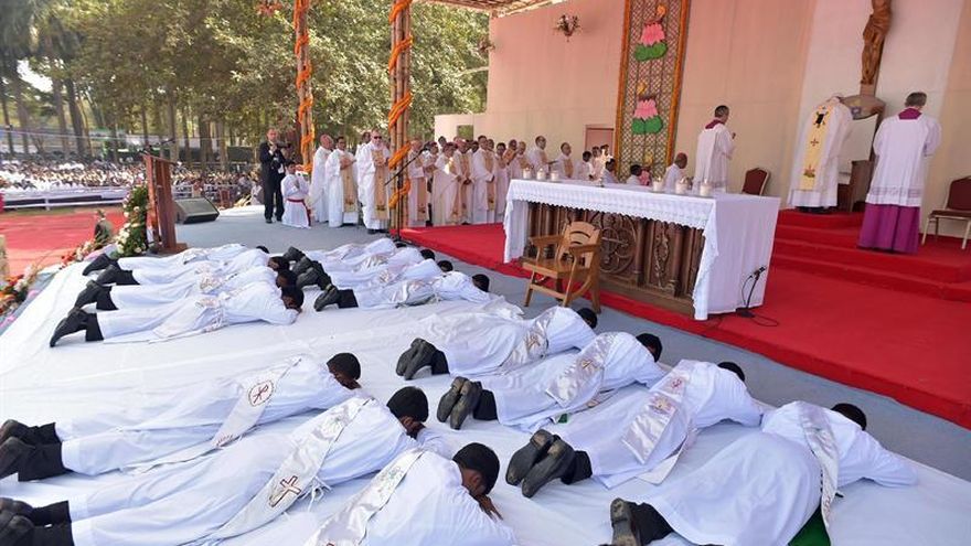 Francisco, a la cabeza de 1.300 millones de católicos en el mundo, busca alentar a las pequeñas Iglesias de las "periferias del planeta". Así, durante la misa, ordenó a 16 nuevos sacerdotes en Bangladés, un país que tiene menos de 400.