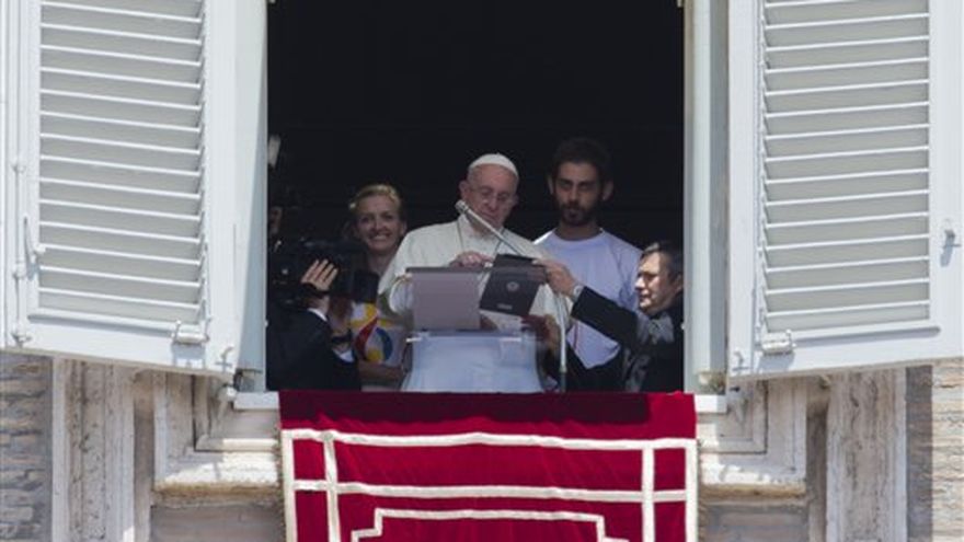 El pontífice fue acompañado por dos jóvenes mientras invitaba a los jóvenes católicos de todo el mundo a unirse a él en Cracovia para el encuentro, que se realizará del 25 al 31 julio de 2016.