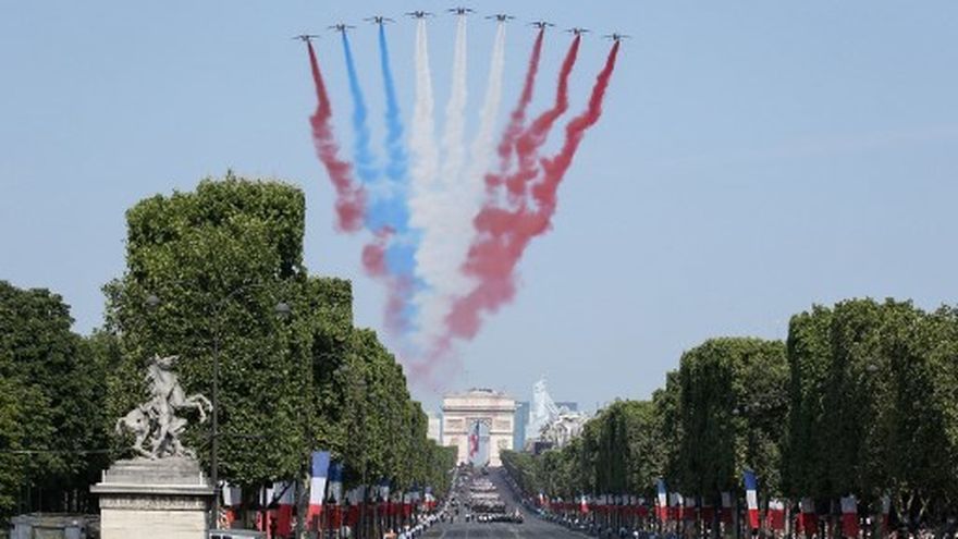 Antes, 64 aviones cruzaron el cielo parisino, entre ellos los Alphajet de la prestigiosa Patrulla de Francia, con tres heridos de guerra de las Fuerzas Especiales a bordo.
