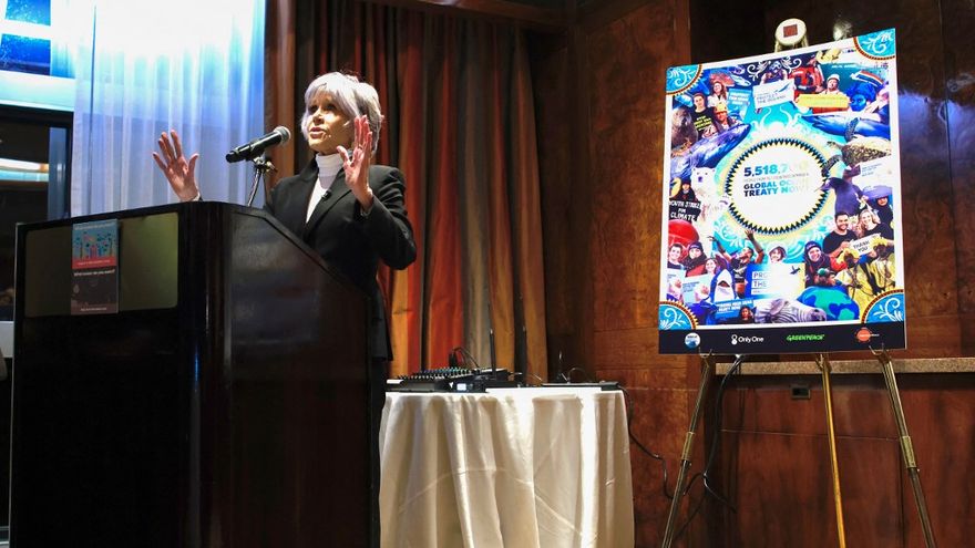 Ícono del cine convertida en la década en 1970 en militante pacifista, feminista, y en favor del medioambiente, Fonda entregó el lunes por la noche a Rena Lee, presidenta de las negociaciones del tratado de altamar, una petición con más de 5,5 millones de firmas para un tratado fuerte.