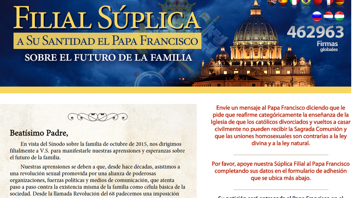 Llamada "Filial Súplica a su Santidad para el futuro de la familia", los firmantes piden con ese mensaje al "papa Francisco que reafirme categóricamente la enseñanza de la Iglesia de que los católicos divorciados y vueltos a casar civilmente no pueden recibir la Sagrada Comunión y que las uniones homosexuales son contrarias a la ley divina y a la ley natural".