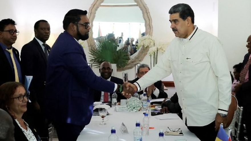 Guyana y Venezuela "acordaron que directa o indirectamente no se amenazarán, ni utilizarán la fuerza mutuamente en ninguna circunstancia, incluidas las derivadas de cualquier controversia existente entre ambos Estados", indicó parte del acuerdo leído por Ralph Gonsalves, primer ministro de San Vicente y las Granadinas, sede del encuentro donde los presidentes Irfaan Ali y Nicolás Maduro se vieron cara a cara.