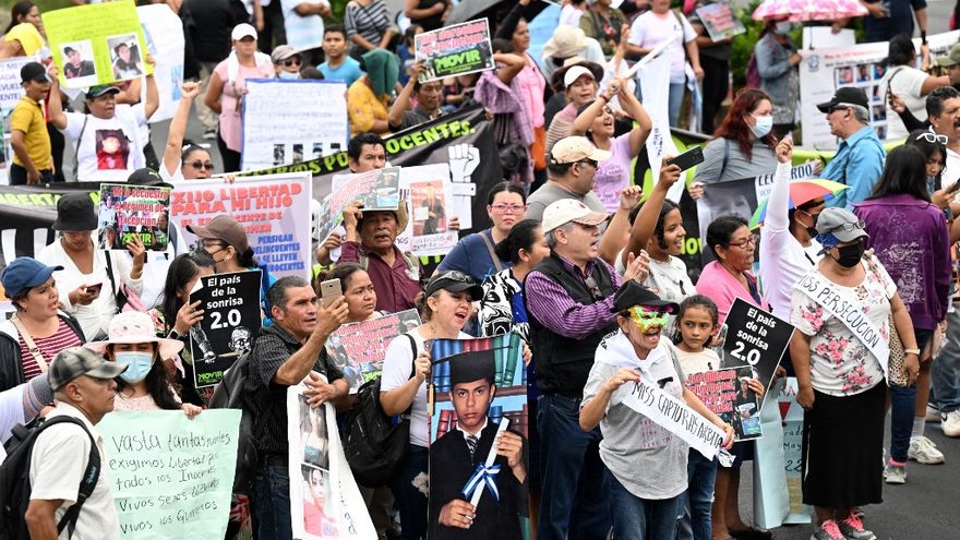 Unas 300 personas se manifestaron por las principales calles de San Salvador con pancartas, fotos de detenidos y lemas contra las medidas de excepción vigentes desde marzo de 2022 como punta de lanza del gobierno en su "guerra" contra las pandillas.