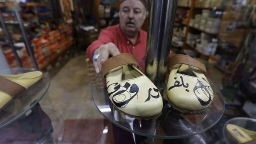 En Ramala, un palestino fabrica zapatos anti-Macron y anti-Trump
