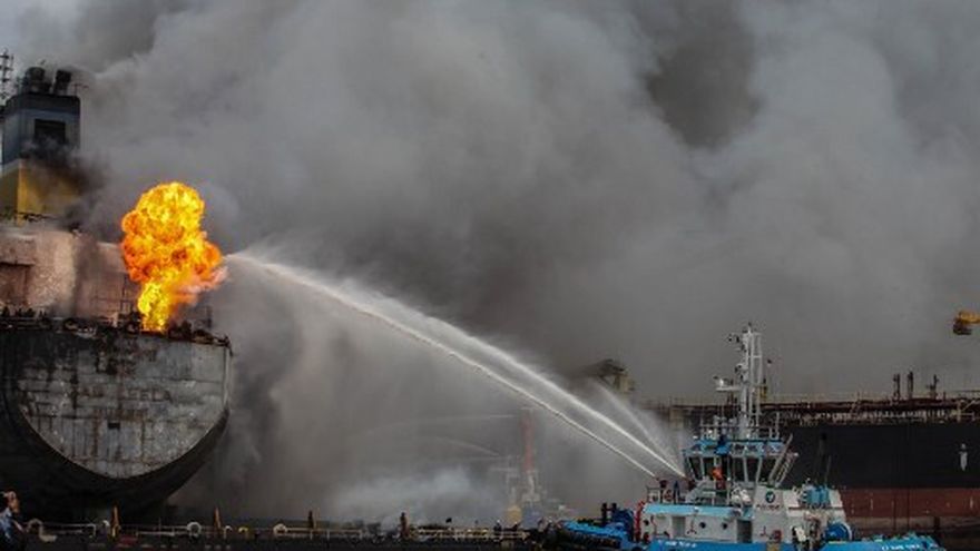 Varios videos difundidos en redes sociales muestran una larga embarcación en llamas, varada cerca de la costa.