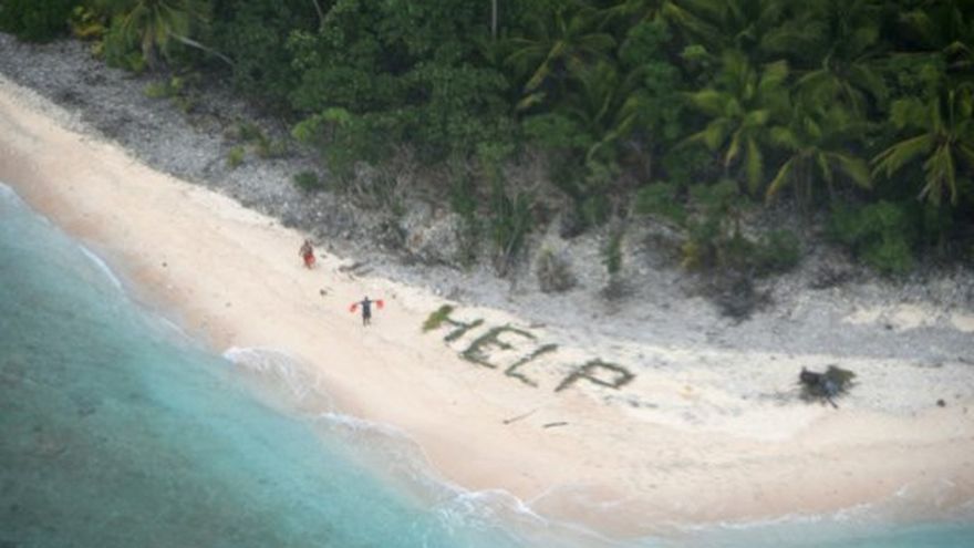Micronesia/Cuando no hay salida, a veces solo queda pedir "AYUDA": esa fue la lección que tres marineros aprendieron esta semana luego de quedar atrapados en una isla desierta del Pacífico y escribir un mensaje gigante hecho de palmas que sus rescatistas lograron ver desde el cielo.