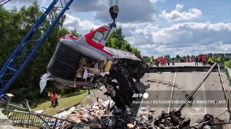 "El derrumbe de un puente sobre la vía férrea dejó siete muertos", indicó el gobernador de la región de Briansk, Alexander Bogomaz, agregando que 66 personas resultaron heridas, entre ellas tres niños.