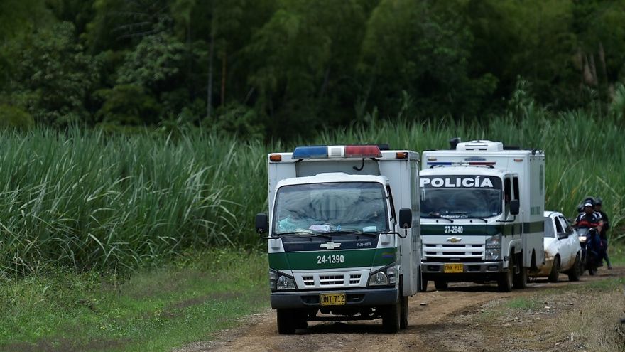 Vehículos de la policía transportan los cadáveres de cuatro personas asesinadas en Guachinte, Colombia. / AFP
