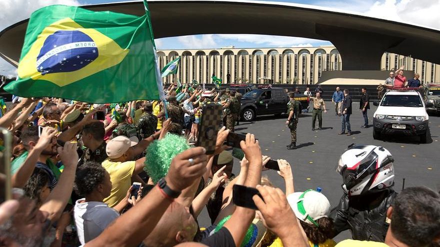 "Estoy aquí porque creo en ustedes. Ustedes están aquí porque creen en Brasil", manifestó el mandatario sobre una camioneta, en un repetitivo discurso en el que volvió a insistir sobre la lucha contra "la vieja política" y en el espíritu "patriótico" de los brasileños.