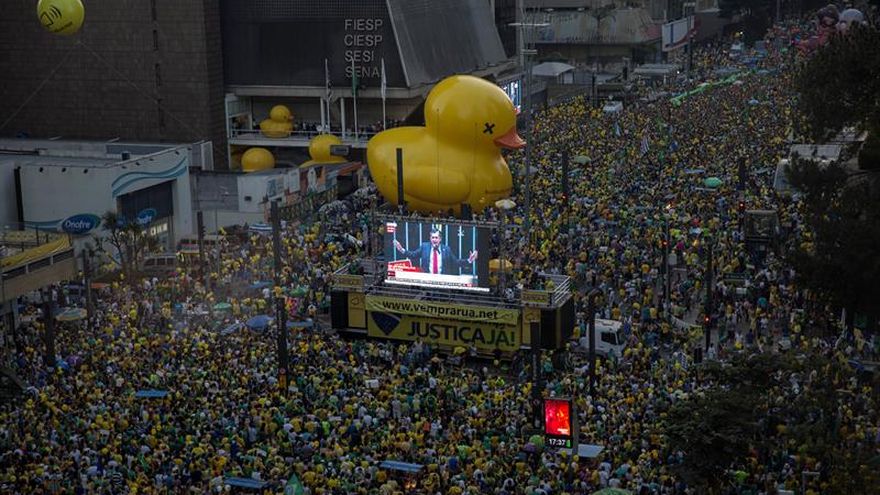 En Sao Paulo, donde se desarrolló la movilización más numerosa contra el Gobierno, la marea verdeamarilla, los "coxinhas", como se les conoce popularmente, tomaron la Avenida Paulista y se concentraron frente a la sede de la patronal industrial, la más influyente del país.
