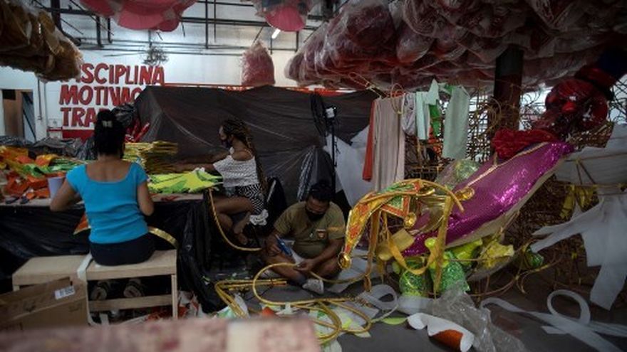 Carpinteros, soldadores, diseñadores, costureras... el ajetreo es grande en los galpones de la Ciudad del Samba, un espacio colectivo en la zona portuaria donde cada escuela prepara a puertas cerradas sus suntuosos desfiles.