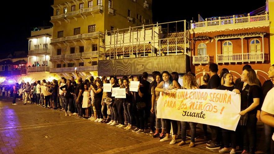 Cientos de cartageneros protestan en la madrugada de hoy, viernes 16 de marzo de 2108, para rechazar la prostitución y especialmente la explotación sexual de niños y adolescentes, en la Plaza de los Coches del centro histórico de Cartagena de Indias (Colombia). / EFE