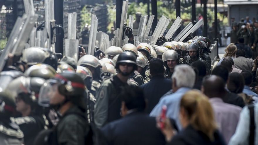 Apostados en los alrededores del palacio legislativo (centro de Caracas), los chavistas lanzaron bombas de estruendo y golpes a los efectivos de la Guardia Nacional en reproche por evitar su avance hacia el punto por donde pasaban los diputados, constataron reporteros de AFP.