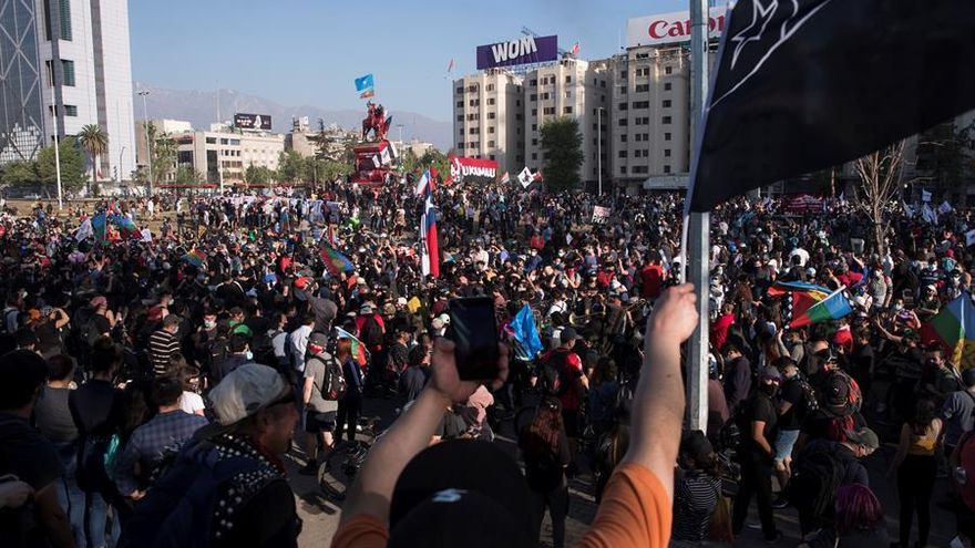 Santiago/Miles de personas coparon este viernes la céntrica Plaza Italia, en Santiago de Chile, en la protesta más multitudinaria que se celebra desde el inicio de la pandemia en marzo y a dos días del primer aniversario del llamado "estallido social".