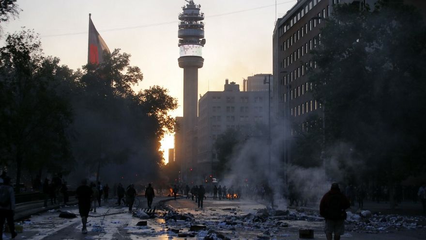 El centro de Santiago muestra por la mañana imágenes dantescas de destrucción: semáforos en el suelo, restos de autobuses quemados, comercios saqueados y miles de piedras y palos sobre las calles tras la serie de protestas que se iniciaron el viernes con el alza de las tarifas del metro pero que luego hicieron eco de muchas otras reivindicaciones sociales.