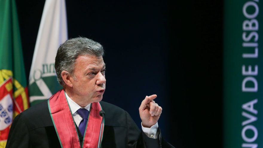El presidente de Colombia y premio Nobel de la Paz, Juan Manuel Santos, en un acto ayer lunes, en Portugal / EFE