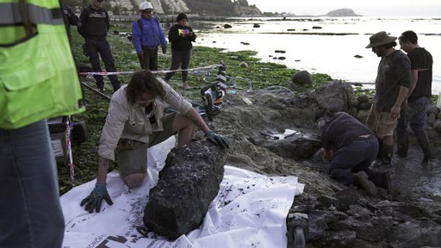 Algarrobo, Chile/Paleontólogos trabajan de prisa antes de que suba la marea en una playa de la costa central de Chile: rescatan los restos fósiles de un singular reptil marino que vivió hace 70 millones de años, un tesoro para los científicos.
