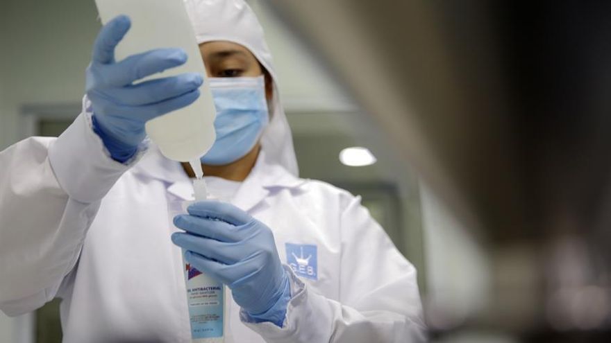 Operarios de la empresa Eurobelleza mientras trabajan en la elaboración de geles antibacteriales, en Cali (Colombia). / EFE