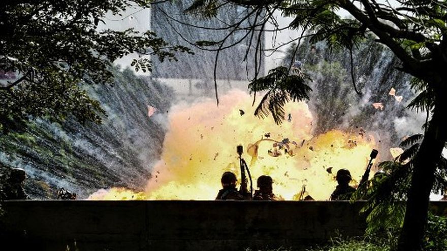 Videos que circularon en redes sociales muestran el momento en que los militares, que se desplazaban en motocicletas, son alcanzados por las llamas tras la fuerte detonación.