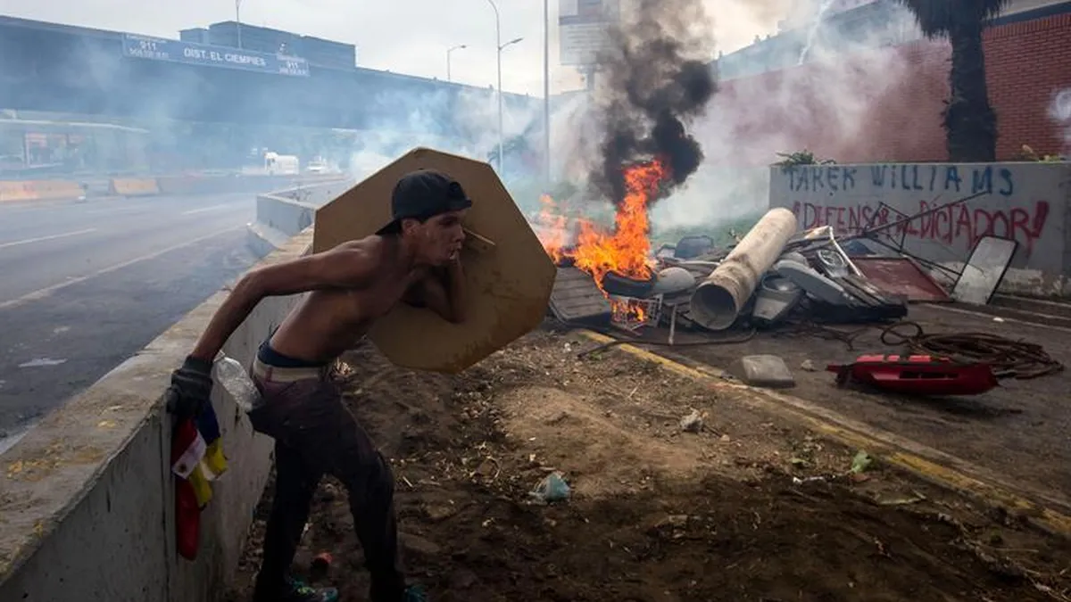 Un manifestante se protege durante una confrontación con miembros de la Guardia Bolivariana este 3 de mayo de 2017, en Caracas (Venezuela). / EFE