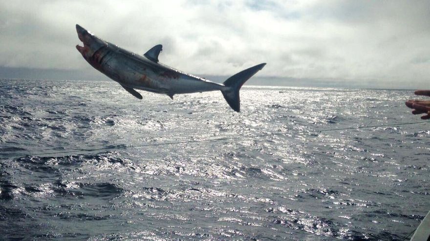 El comandante de la Armada Ricardo Cartes explicó que los tiburones de la especie tintorera o azulejo estaban atrapados en una red llena de anzuelos.