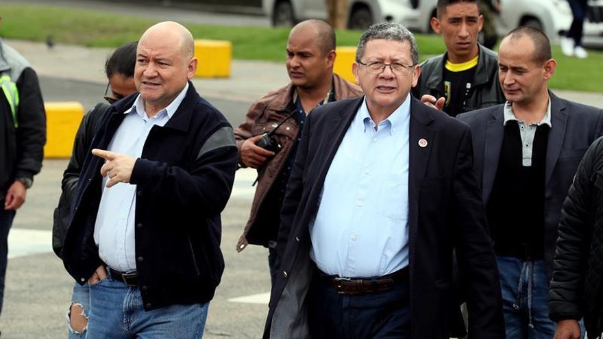 Pablo Catatumbo y Carlos Antonio Lozada, integrantes del partido Fuerza Alternativa Revolucionaria de Colombia en el que se convirtió la antigua guerrilla FARC, visitaron hoy en los calabozos de la Fiscalía al también exlíder insurgente Jesús Santrich, quien fue capturado por narcotráfico.