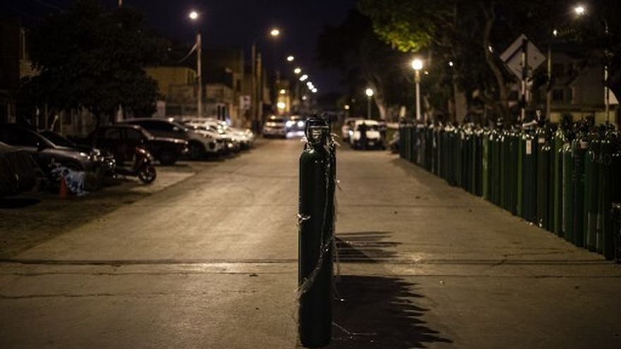 Y la escasez de oxígeno medicinal lleva a cientos de limeños a hacer filas de hasta 72 horas, durmiendo en la calle, para comprar este elemento indispensable para sus parientes enfermos de gravedad.