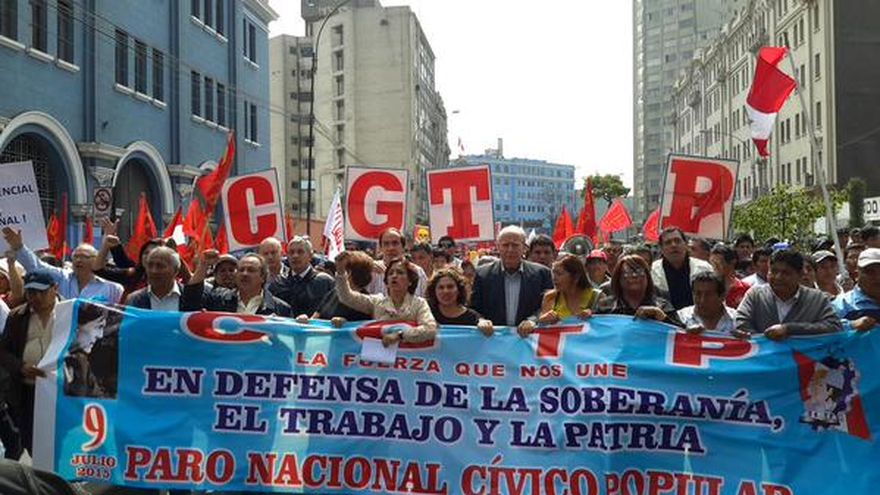 Miles de trabajadores, estudiantes y comerciantes pidieron este jueves un aumento de salarios y la erradicación de la corrupción y de la inseguridad ciudadana en una marcha pacífica por calles de Lima, que culminó con la entrega de un documento en el Palacio de Gobierno.