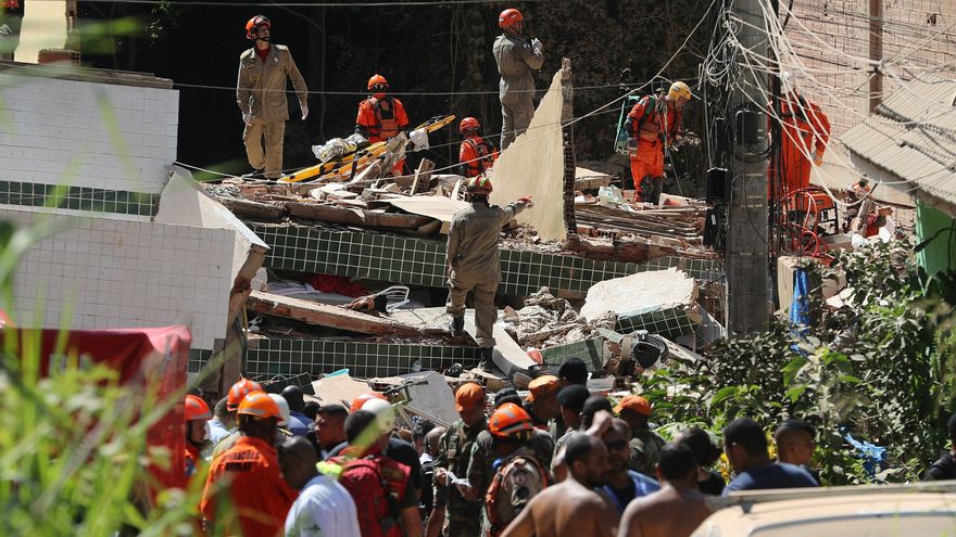 Al menos dos personas murieron este viernes cuando dos edificios se derrumbaron en una favela de la zona oeste de Río de Janeiro, informaron los bomberos, que continúan buscando sobrevivientes entre los escombros.