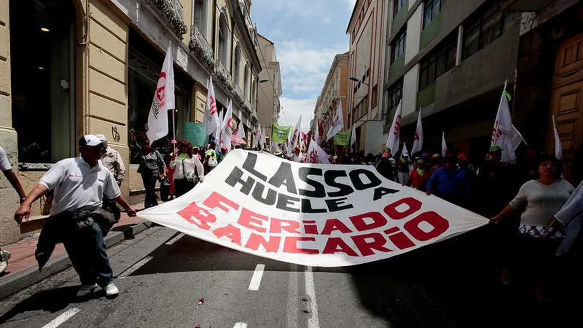 "No más muertes por el feriado bancario"; "Lenín Presidente"; "El mayor atraco de la historia lo produjeron los banqueros"; "El feriado bancario mató, empobreció, desbarató hogares" y "Lasso, banquero, jamás, jamás serás presidente", eran algunos de los lemas que exhibían las pancartas portadas por los manifestantes.