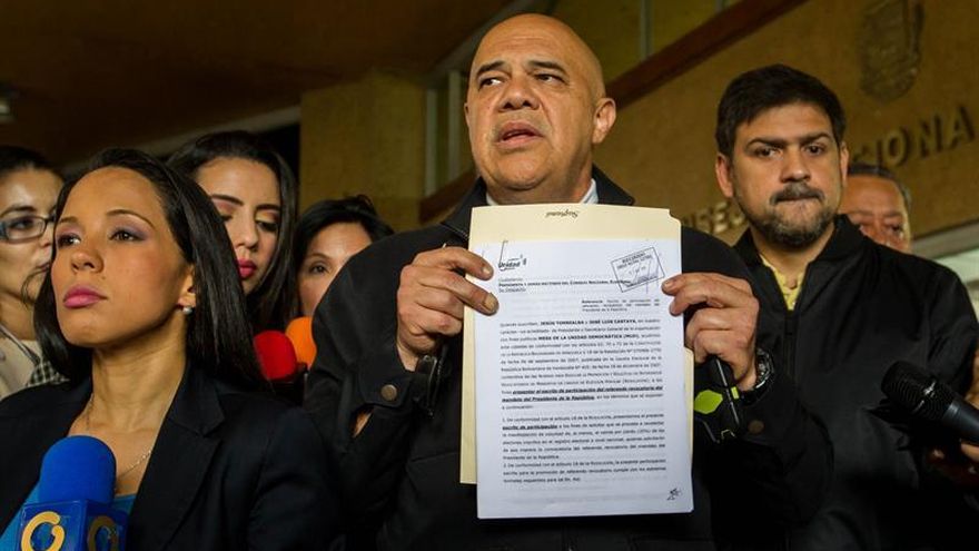 El anuncio del vocero del bloque político, que agrupa a la mayoría de la oposición venezolana, se realiza cuando se prevé hoy una comparecencia del Consejo Nacional Electoral venezolano (CNE) para referirse al trámite de referendo con el que la MUD pretende acortar el mandato del presidente de la nación petrolera.