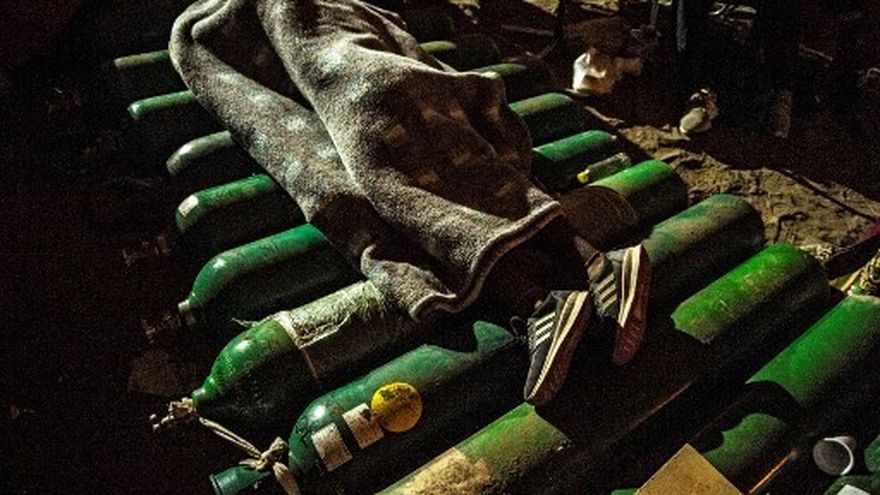 Afuera de los locales de venta de oxígeno hay largas colas desde hace un mes, por lo que tienen vigilancia policial. Algunos clientes contaron a la AFP que demoraron cuatro días en comprar una recarga, por lo que dormían en la calle.