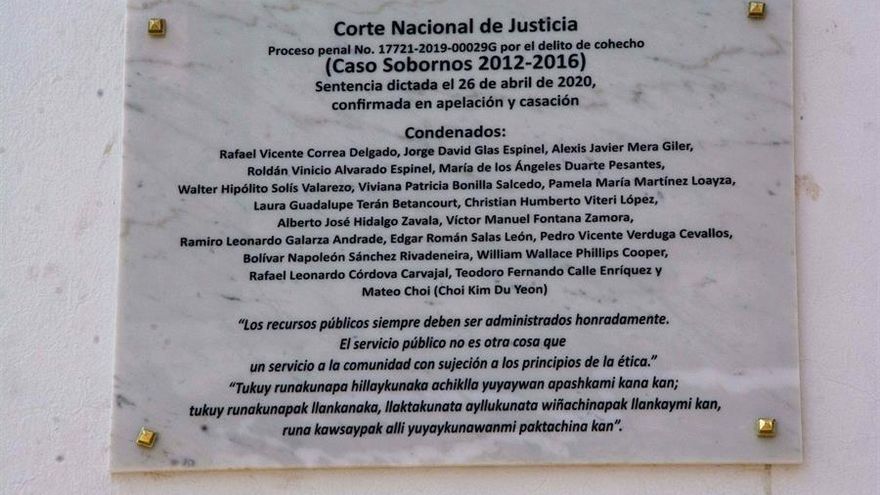La orden de colocar una placa forma parte de la reparación inmaterial de la sentencia por el delito de cohecho contra Correa y el exvicepresidente Jorge Glas, quien cumple prisión por otro caso de corrupción, esta vez relacionado con la trama Odebrecht.