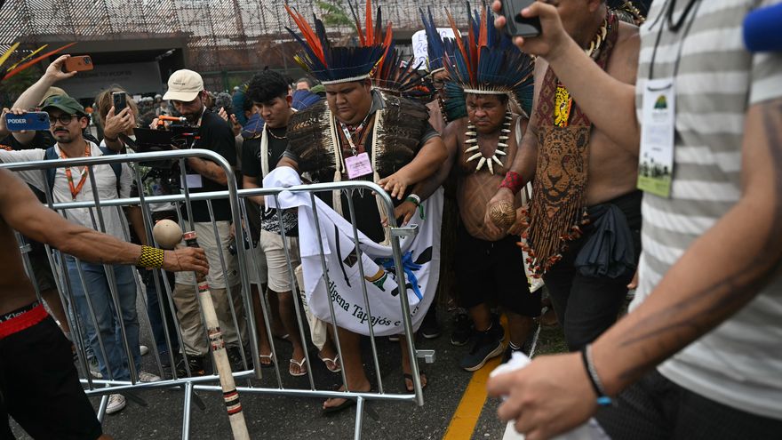 El viernes, unos 60 miembros de la comunidad munduruku, ataviados en su mayoría con ropas y tocados tradicionales, se posicionaron frente al acceso principal del complejo y una calle adyacente, perturbando temporalmente la agenda de decenas de miles de delegados y observadores.