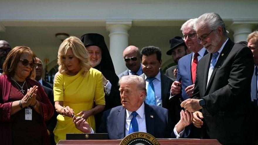 Líderes cristianos, judíos, musulmanes y de otras religiones cantaron el himno "Amazing Grace" mientras el multimillonario, casado tres veces, firmaba un decreto por el que creó la denominada Comisión para la Libertad Religiosa.