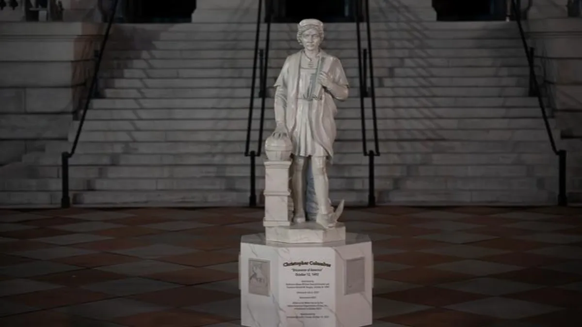 La figura de mármol del navegante y descubridor Colón es una réplica de otra derribada por manifestantes antirracistas en la ciudad de Baltimore en 2020.