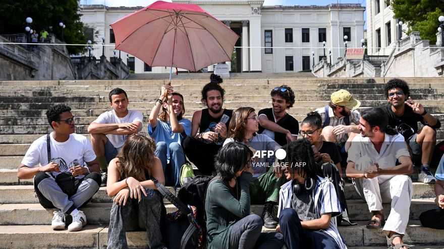 Sentados en la escalinata de la céntrica Universidad de La Habana (UH), los jóvenes protestaron por las dificultades para acceder a internet durante las clases a distancia, implementadas en la isla desde el 6 de febrero, como parte de un paquete de medidas de emergencia.