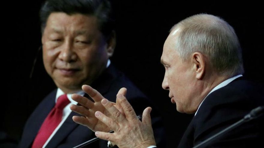 El presidente ruso, Vladímir Putin (dcha), y su homólogo chino Xi Jinping, participan en el Foro Económico Internacional de San Petersburgo (Rusia). / EFE