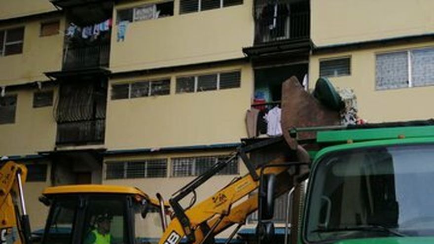 Montañas de basura, cúmulos de inmundicia y desechos varios rodeaban el edificio. Fue necesario utilizar retroexcavadoras para remover los desperdicios y colocarlos en camiones.