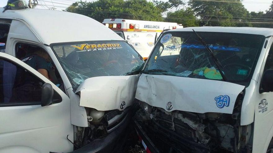 Dos busitos, unode loscuales era pirata y el otro, con logo de la Autoridad de Tránsito,pertenecía a una concesionaria de transporte, colisionaron de frente la mañana de este miércoles 13 de agosto de 2014 en Veracruz, distrito de Arraiján, Panamá Oeste.