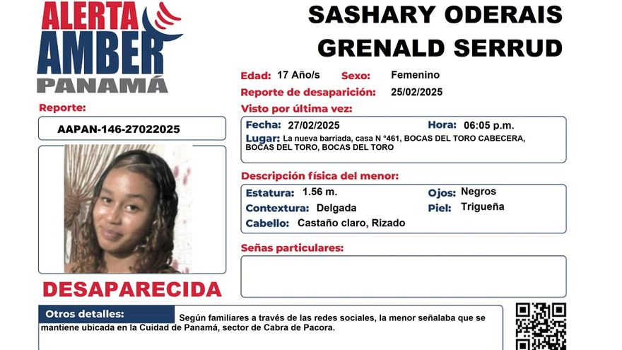 Bocas del Toro/La noche de este jueves 27 de febrero, las autoridades activaron una nueva alerta Amber para dar con el paradero de Sashary Oderais Grenald Serrud, una adolescente de 17 años desaparecida desde el 25 de febrero.