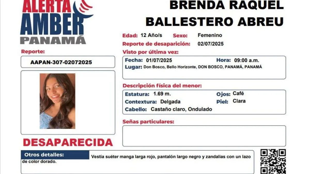 Se trata de Brenda Ballestero Abreu, de 12 años, quien fue vista por última vez el pasado 2 de julio a las 9:00 a.m. en Don Bosco, Bello Horizonte, provincia de Panamá.
