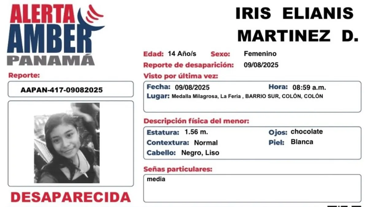 Ciudad de Panamá, Panamá/Cumpliendo con los parámetros establecidos en la Ley 469 del 8 de mayo de 2025, las autoridades han procedido a activar la alerta Amber por la desaparición de Iris Elianis Martínez Delgado, de 14 años de edad, y solicitan la colaboración de toda la ciudadanía para dar con su paradero.