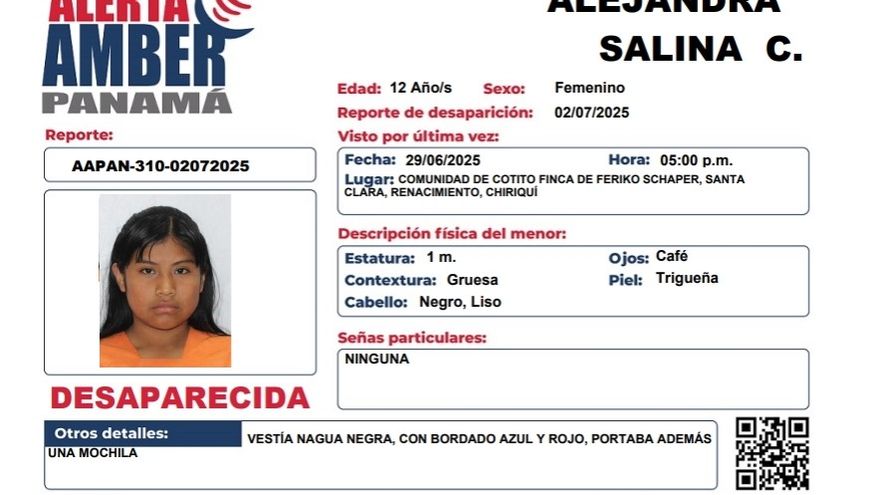 Las desaparecidas son Alejandra Salina C. de 12 años, quien fue vista por última vez el 28 de junio de 2025 a las 5 de la tarde en la comunidad de Cotito, Renacimiento, provincia de Chiriquí. Al momento de su desaparición, Salinas vestía nagua negra con bordado azul y negro. Además, portaba una mochila. Según la información proporcionada, la menor mide 1 metro, el color de sus ojos es café, su contextura es gruesa, es de piel trigueña y cabello liso negro.