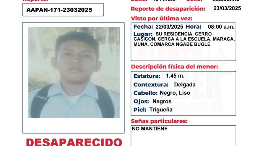 El adolescente de 13 años de edad fue visto por última vez el sábado 22 de marzo a las 8:00 a.m. en su residencia en cerro Casicón, cerca de la escuela Maraca Muná, en la comarca Ngäbe Buglé.